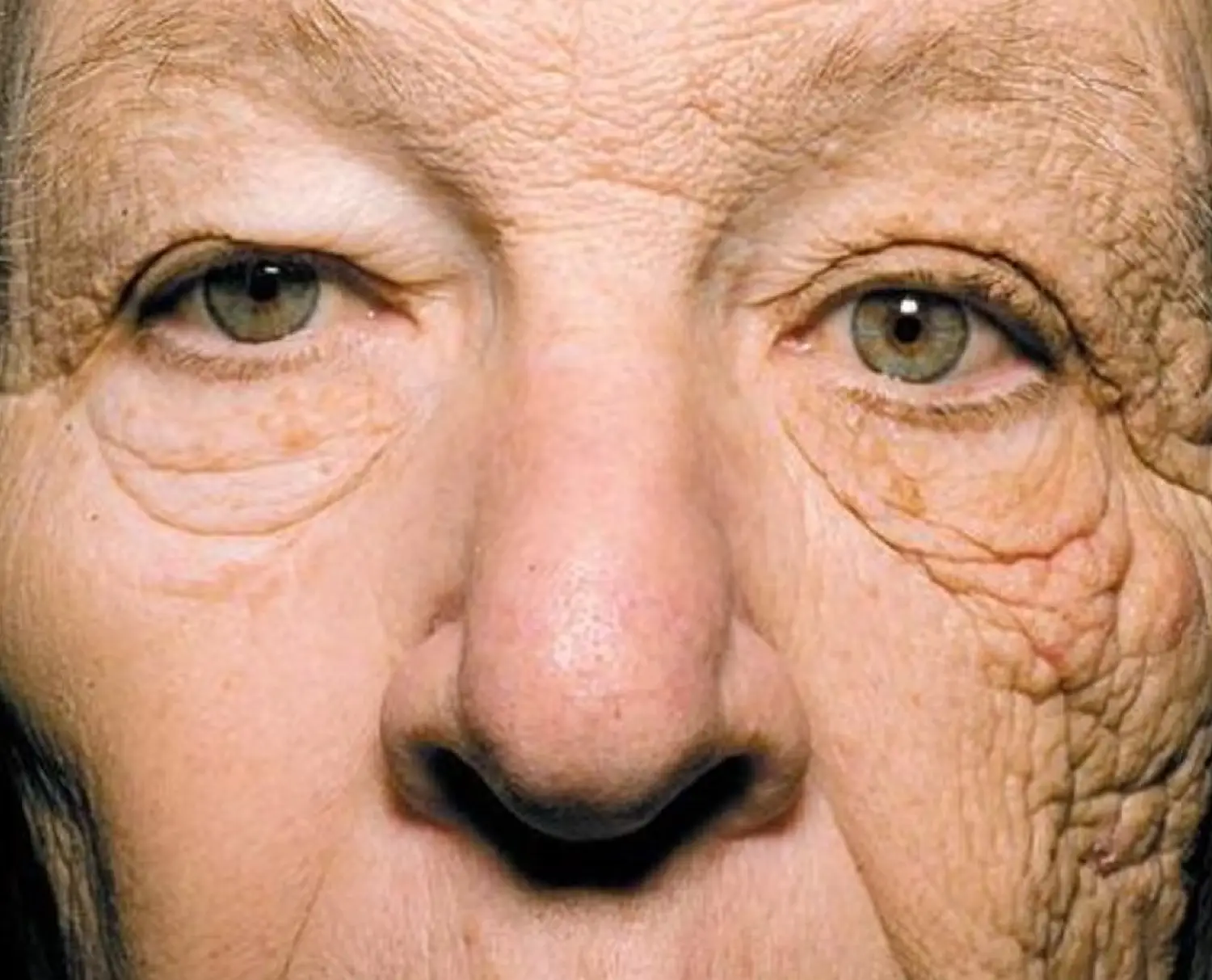 A 92-year-old woman with sunscreen application only on her face but not her neck for more than 40 years.