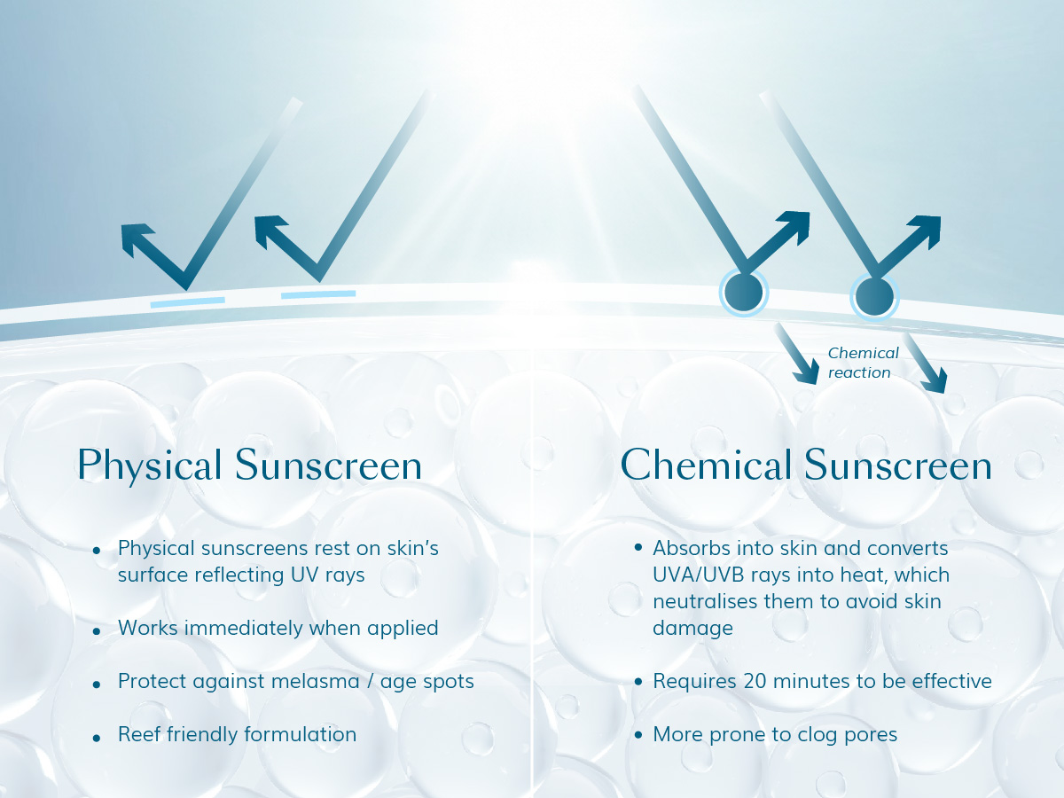 The key difference lies in how they block the sun's harmful rays. Physical sunscreens are like tiny shields, they reflect UV rays away from your skin, while chemical sunscreens absorb these rays and convert them into heat that's released from your body.