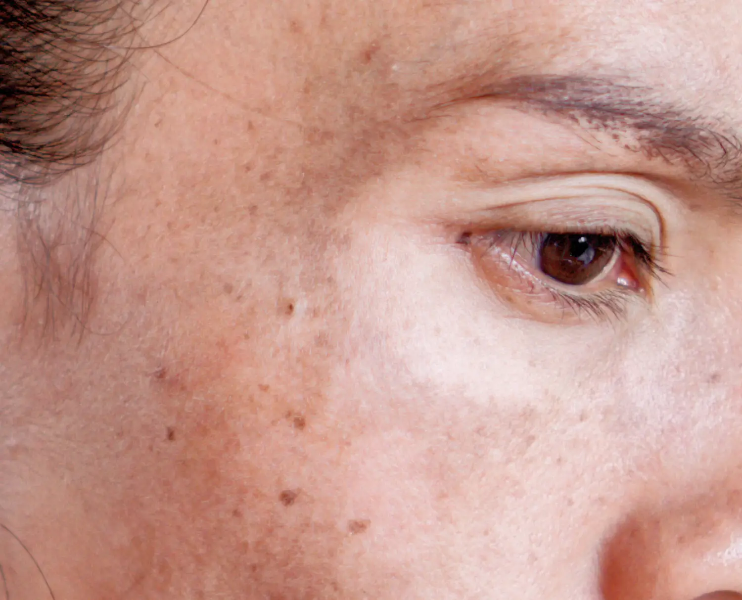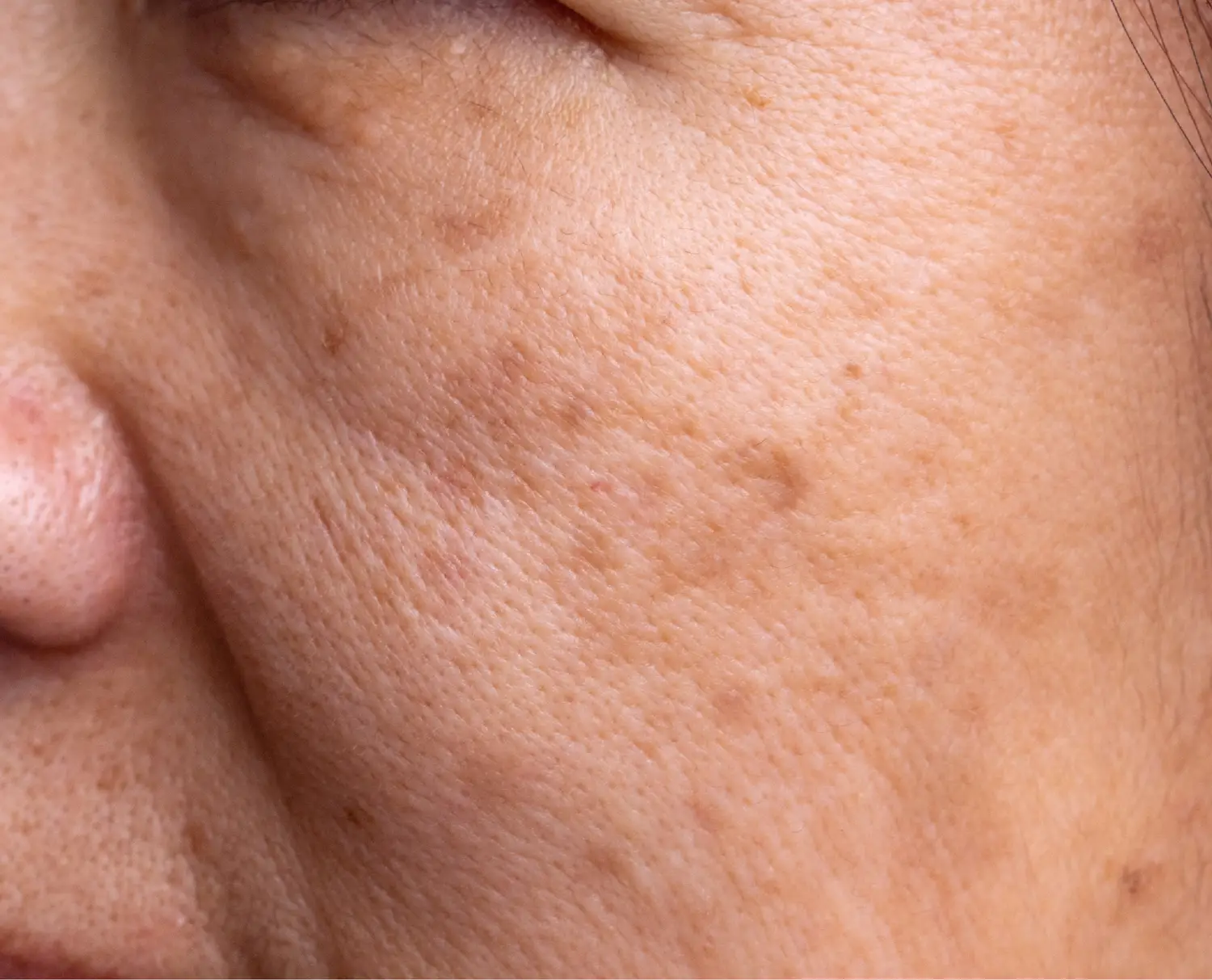 To protect itself from the damaging effects of the sun, skin makes more brown pigment, called melanin. But sometimes, the skin doesn't make melanin evenly which looks patchy, called pigmentation.